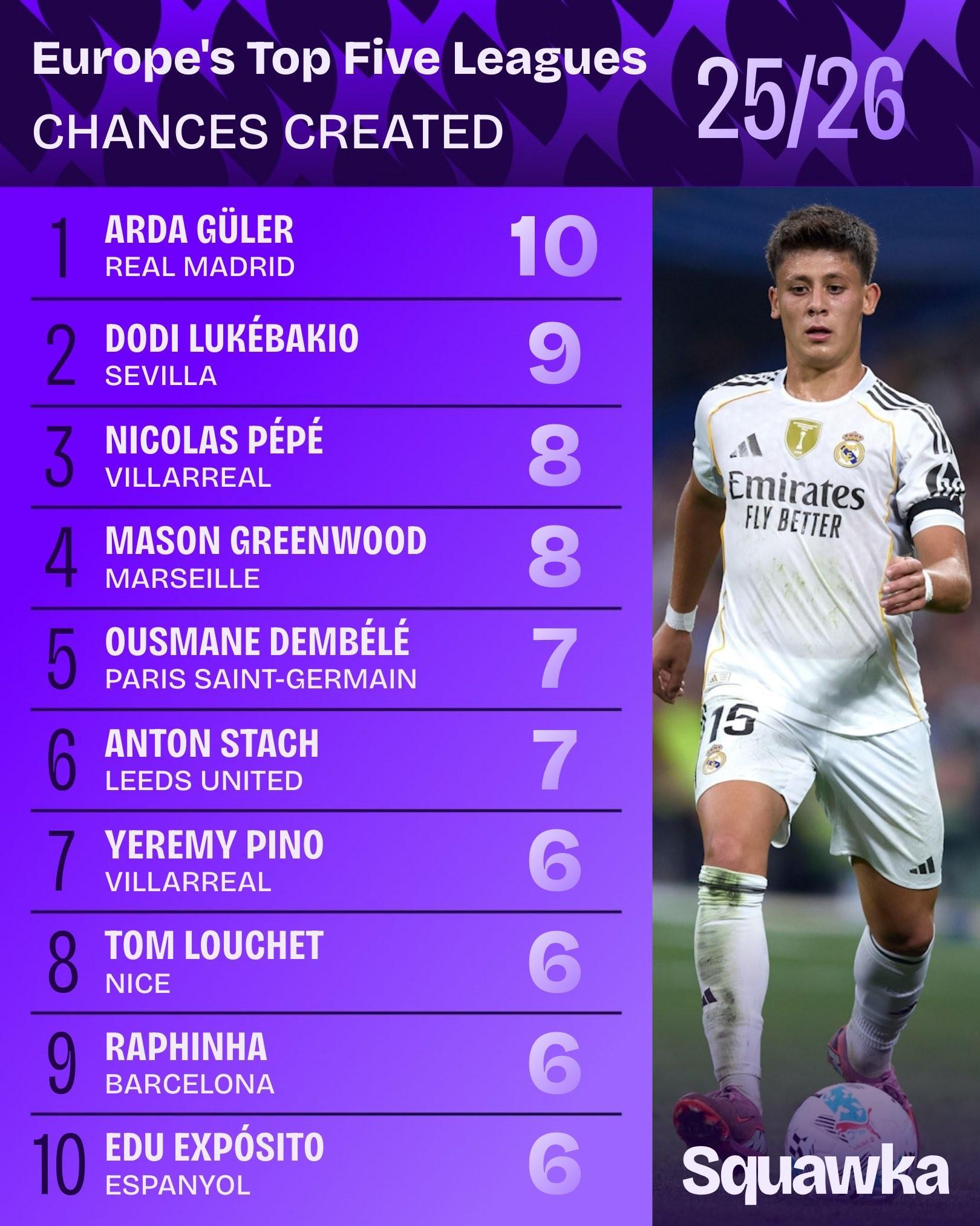 北京时间8月26日,知名数据平台Squawka盘点新赛季五大联赛创造机会榜单,皇马球员居莱尔以10次位列榜首,塞维利亚的卢克巴吉奥9次排在第二,比利亚雷亚尔的尼古拉斯-佩佩和马赛的格林伍德并列第三。