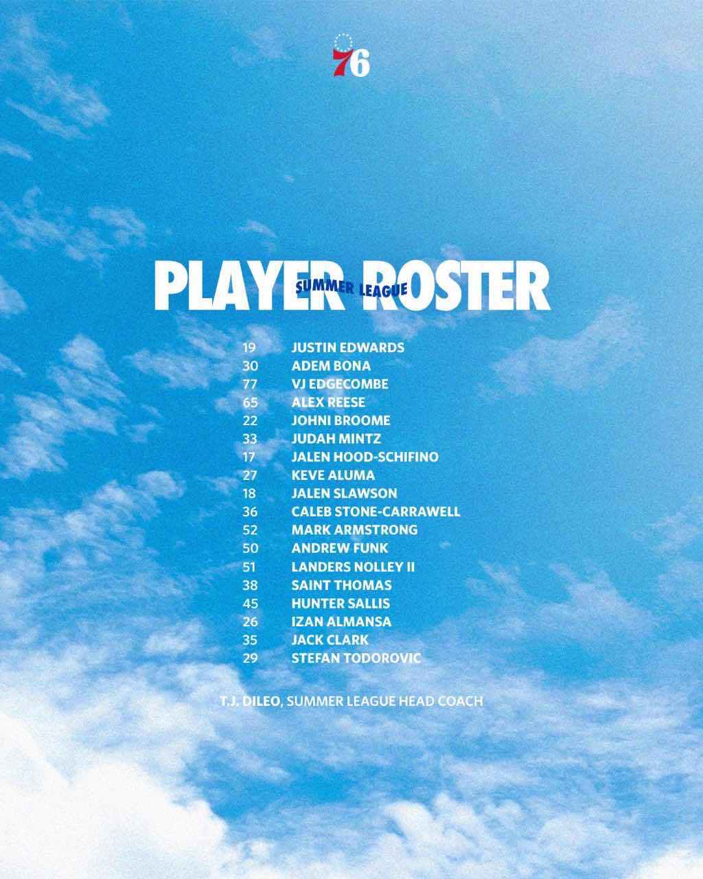 此前公布的夏联名单来看,76人这边由探花VJ·埃奇库姆领衔,还有二轮秀布鲁姆,贾斯汀·爱德华兹,希菲诺能球员,实力不容小觑。